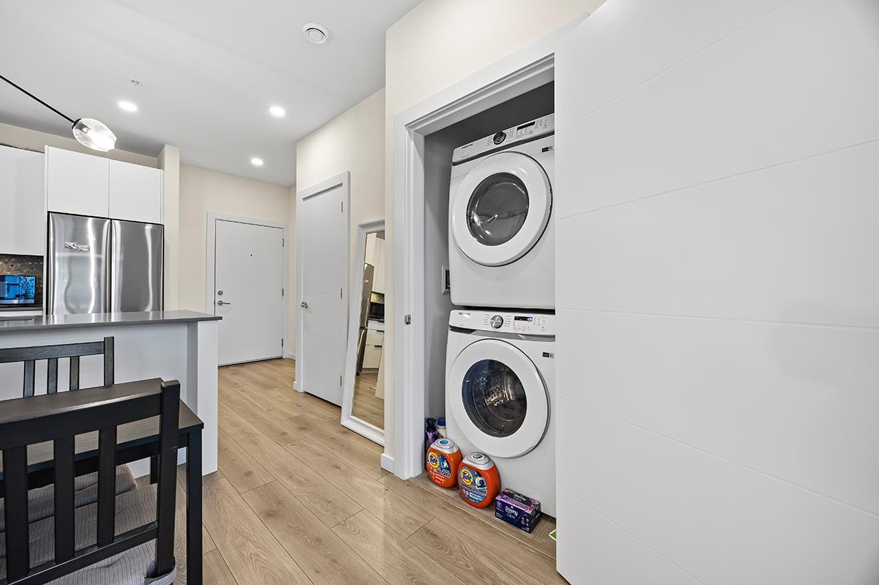 Experience modern living at THE HIVE in desirable Willoughby Heights in Langley. This bright and stylish 1-bedroom home features an open layout with contemporary finishes throughout. Enjoy a sleek kitchen with stainless steel appliances, ample storage, and a functional flow ideal for daily living or entertaining. Large windows fill the space with natural light, creating a warm, inviting atmosphere. The spacious bedroom offers a comfortable retreat, and this rare 5th-floor home includes an oversized balcony available only on this level, perfect for outdoor dining or relaxing. A well-maintained building steps from parks, shopping, dining, and transit-ideal for first-time buyers, downsizers, or investors seeking quality and value in a thriving neighbourhood. (id:9345)...